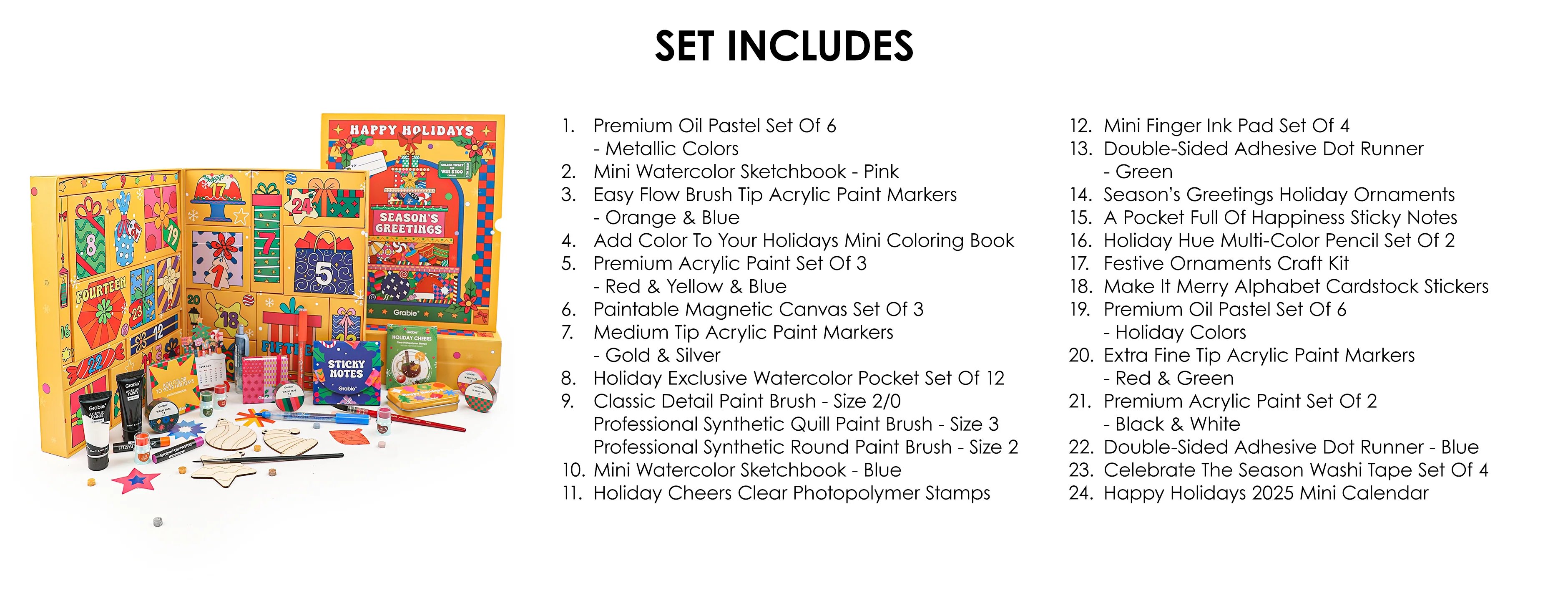 Goodness In One Box:Unwrap daily bursts of artistic delight with our Holiday Advent Calendar! Dive into oil pastels, vibrant watercolors, and a treasure trove of craft supplies that spark your creative genius. From festive-themed ornaments to top-notch brushes and acrylic paints, each surprise is a joyful invitation to unleash your imagination. Elevate your artistry with DIY kits and endless surprises, making this December your most creative and colorful yet!