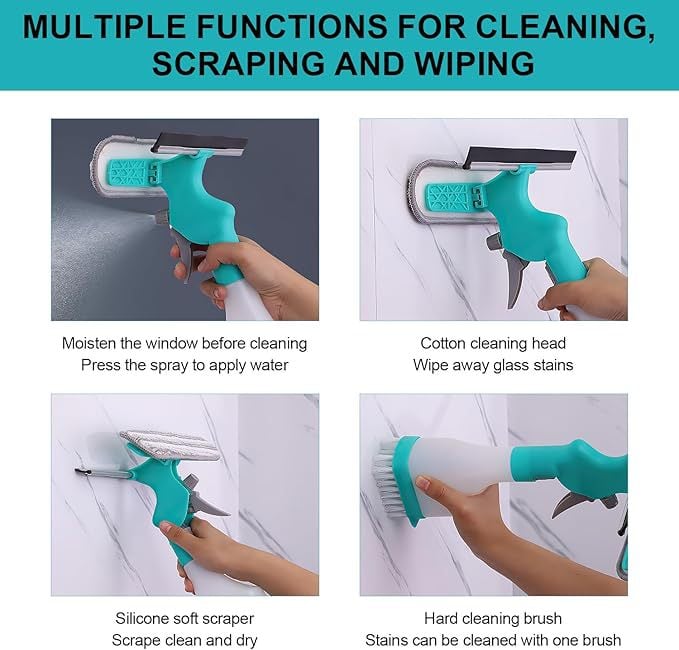 Multifunctional 4 in 1 design: This window cleaning tool integrates multiple functions, including a spray bottle, a wiper, and a microfiber cleaning head to meet your diverse needs in different cleaning scenarios