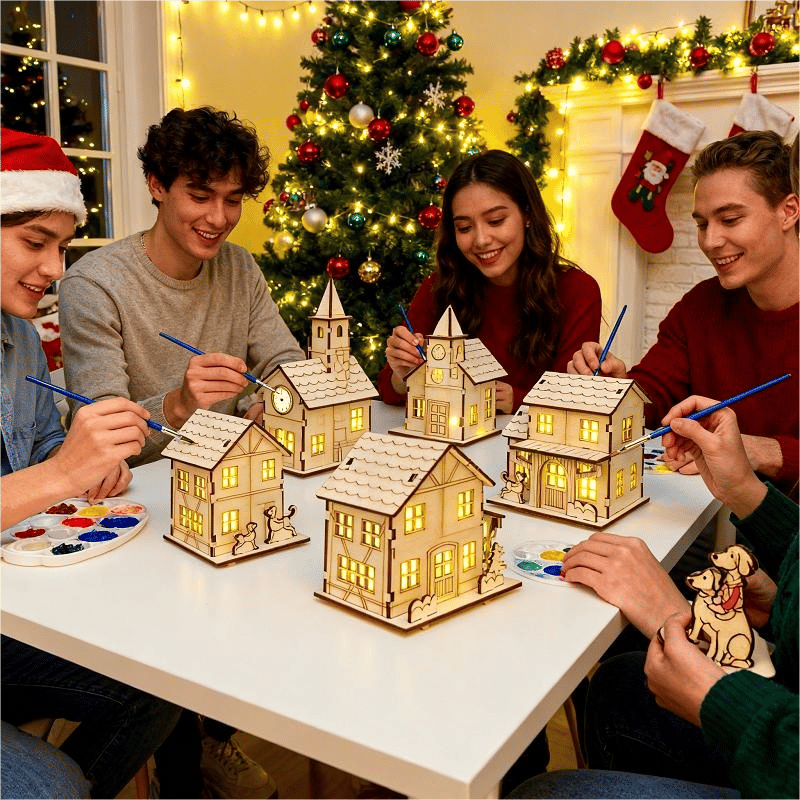 Bring your imagination to life! These light-up wooden Christmas houses can be hand-painted and decorated — a joyful activity to share with family and friends during the holiday season.