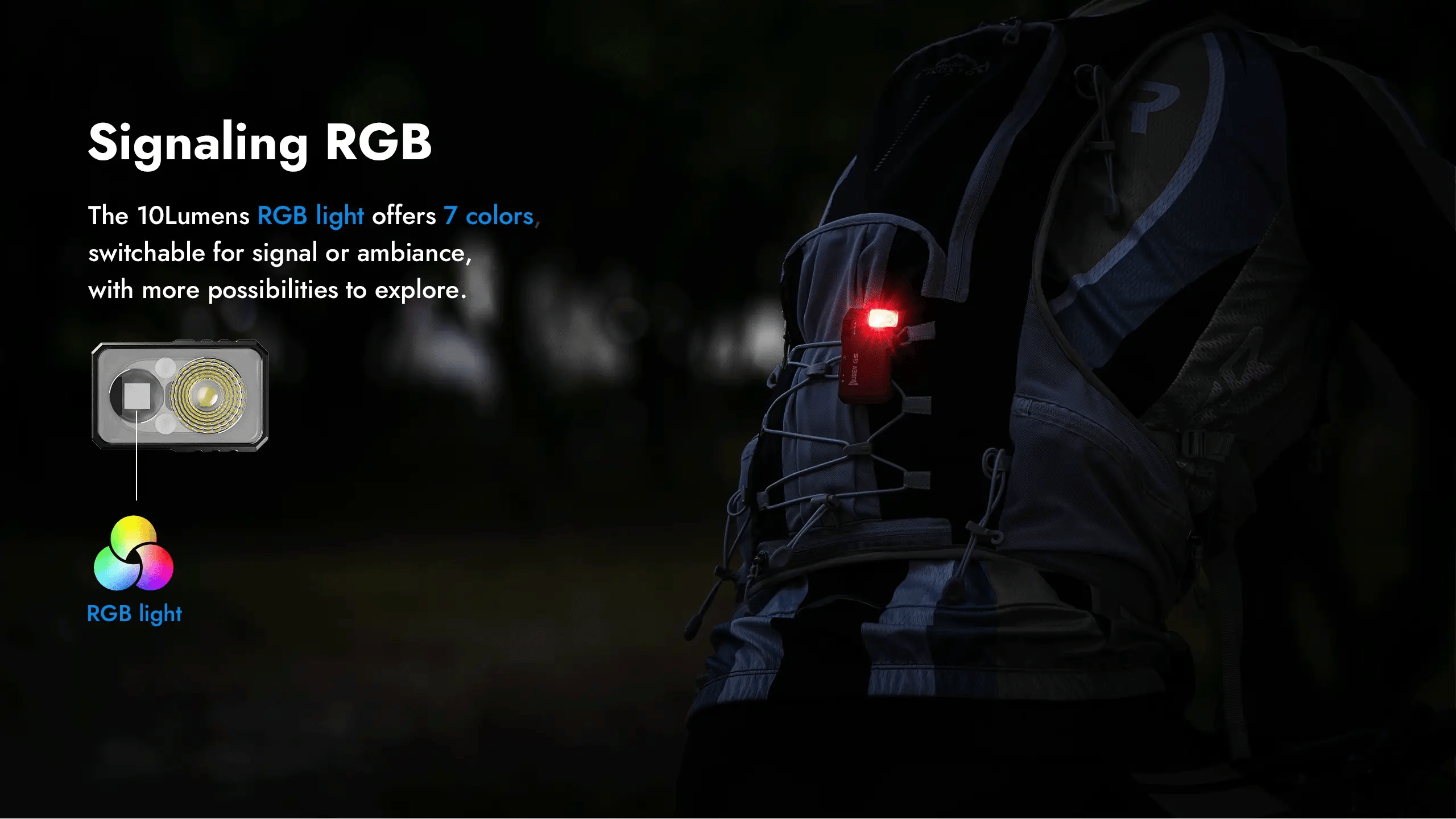 It adopts an LED dual-bead system and has multiple lighting modes. The main light is cold white light with 3 adjustable modes (low, medium, high). The gear can be easily switched by sliding the pulley switch. The auxiliary light is RGB light with 7 colors (red, orange, yellow, green, cyan, blue, purple). The colors can be cyclically changed by sliding the pulley switch. Beacon Mode: In the RGB mode, double-click the button to activate the beacon flashing function of the current color. Warning Light Mode: In the off state, double-click the button to enter the RGB warning flashing function