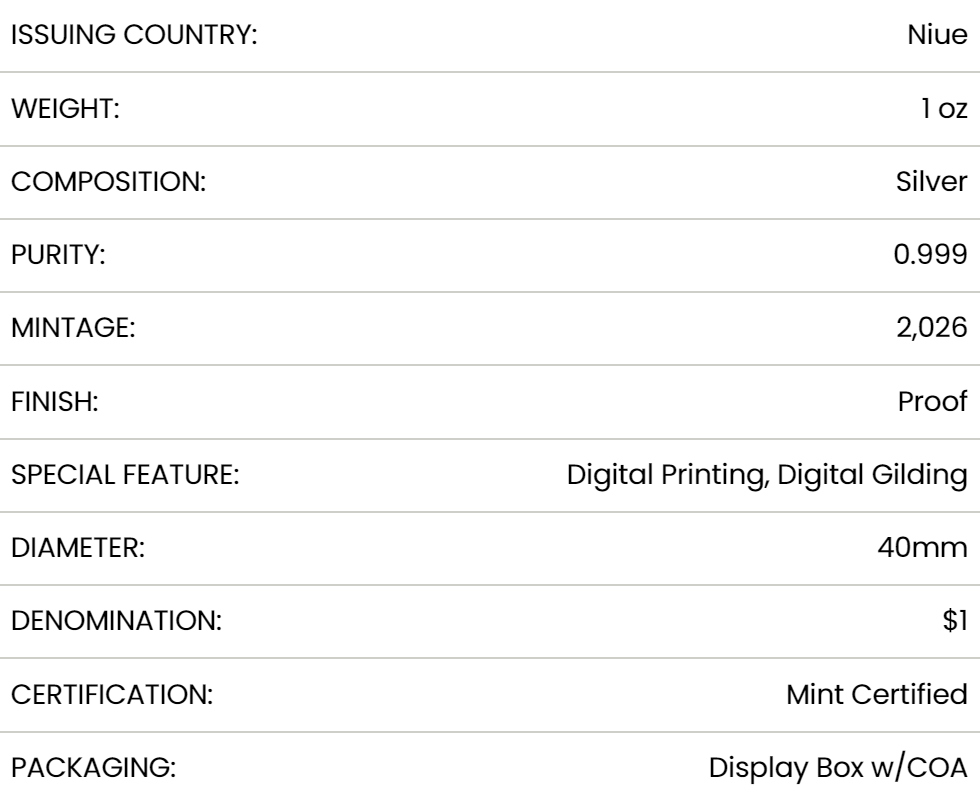 Struck in proof-quality .999 fine silver, the coin weighs one troy ounce and measures 40 mm in diameter. It carries a face value of 1 dollar, issued by Niue. The design features a regal portrait of Her Majesty, enhanced with digital printing and digital gilding. These techniques highlight her poise and the timeless admiration she inspires. Each detail — from the soft contours to the golden accents — reflects both tradition and modern minting skill.