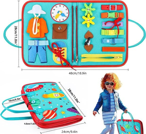 The life skill and cognitive board is linked by zipper, which is removable to allow toddlers focus on and encourage both solo and collaborative play. It makes a great quiet time toy, which can provide relief for parents.