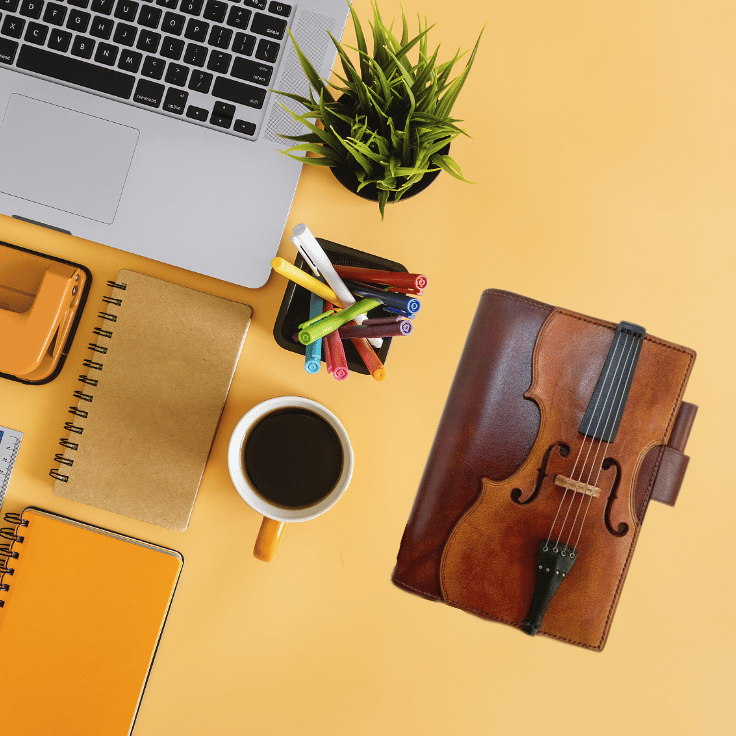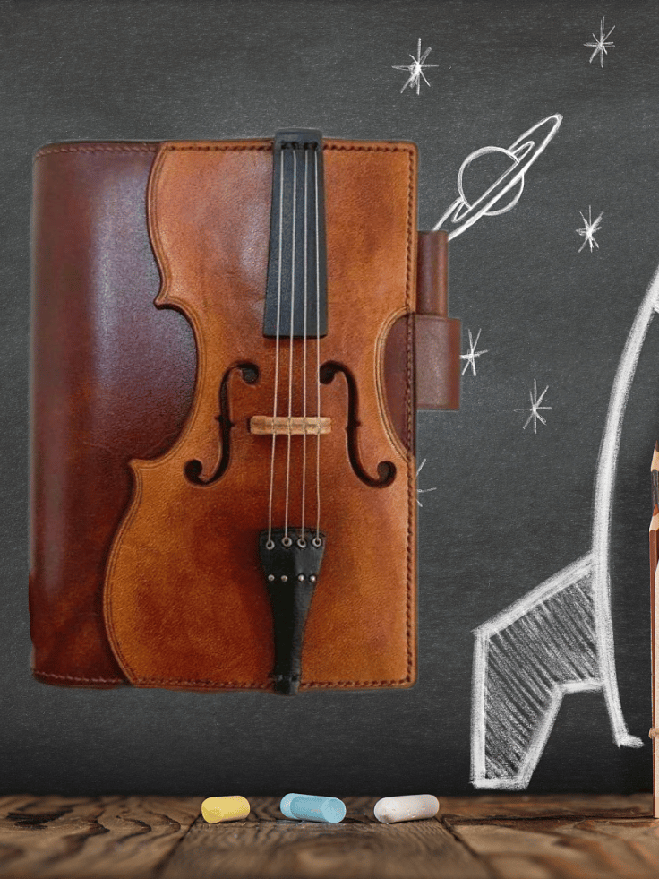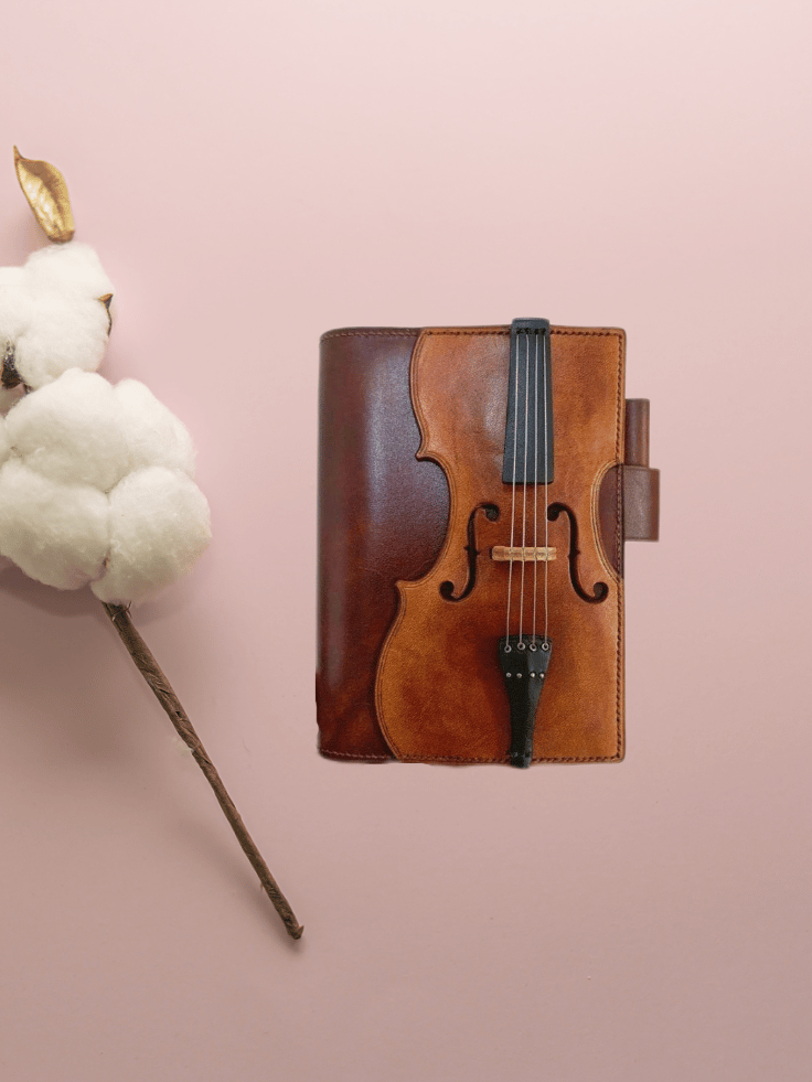 Unique notebook with a beautiful violin-themed cover and classic vintage leather look